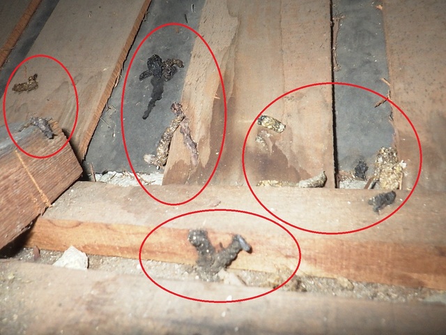 天井裏を調査すると、トイレ前などの隅を中心にフンを確認。