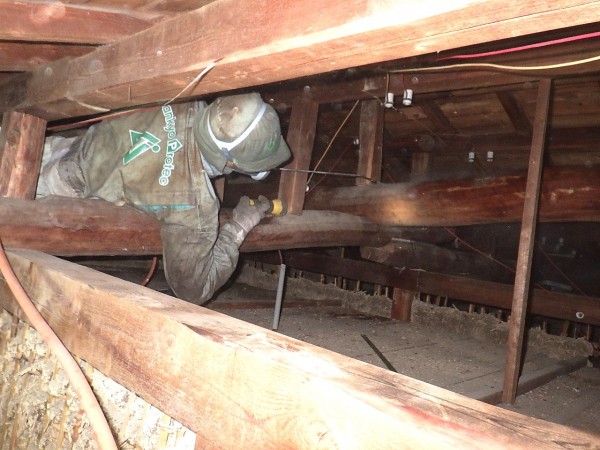 狭い箇所での作業ですが、被害箇所へしっかり薬剤を注入していきます。