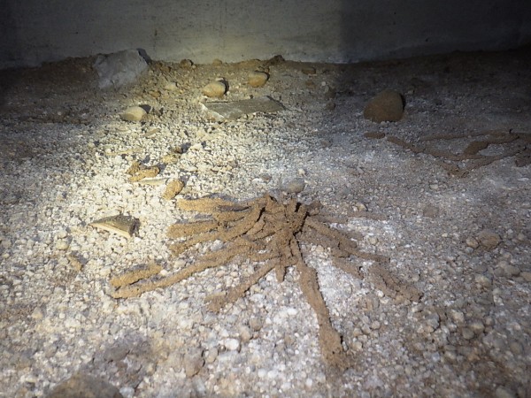 床下では太い蟻道(主に土で形成されたシロアリ専用の通路)がいくつも見られ、天井裏にまで被害が及んでいました。