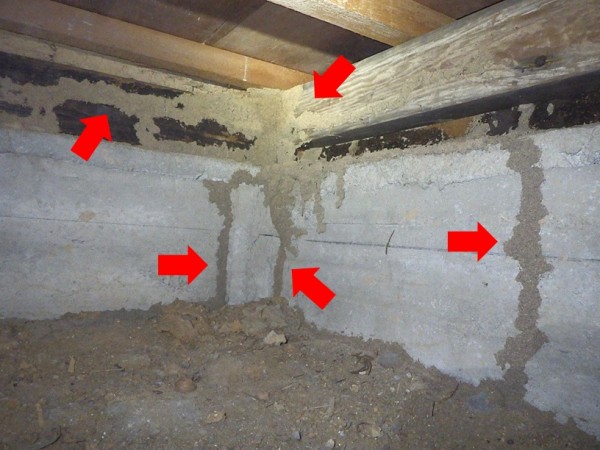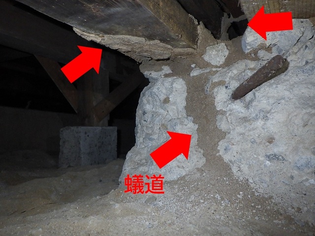 床下を調査すると、各部屋に蟻道(土などで形成されたトンネル状の通路、シロアリはこの中を行き来します)が確認できました。