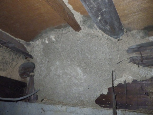 天井裏も被害がおよんでいると思い調査すると、ところどころ被害はあるものの全体にまで広がっていなかったのは幸いでした。