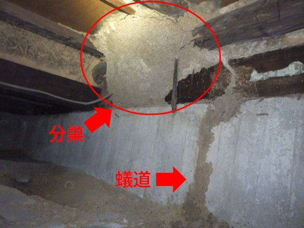 和室の床下では※分巣が形成されており、相当数のイエシロアリが活発に動いていました。