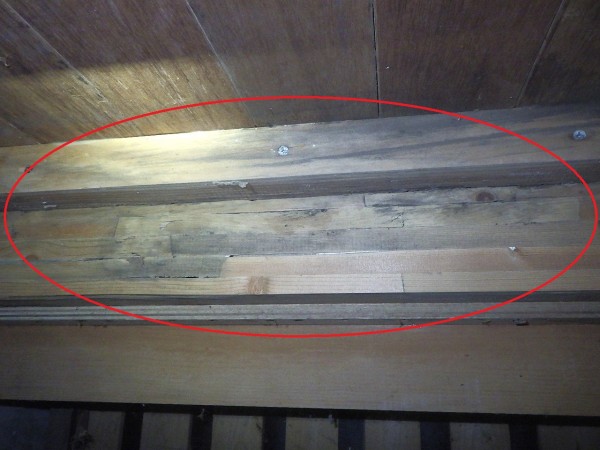また、玄関の框(かまち)部分も大きく食べられていて、上を踏むと沈む状態です。