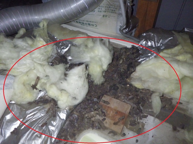ユニットバスの点検口から天井裏をのぞくと、そこには大量のフンが確認できました。