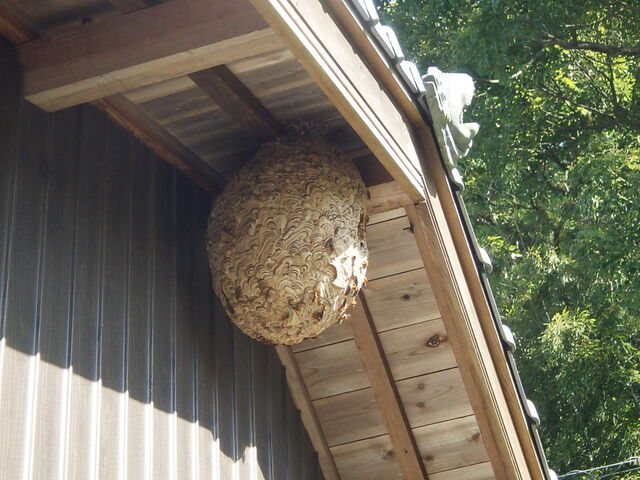 2階の軒裏に巣があるとお聞きして現場に行ってみると、キイロスズメバチの大きな巣が見えました。