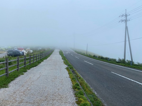 やっと到着したものの見渡す限りの霧景色。真っ白で先が見通せません。