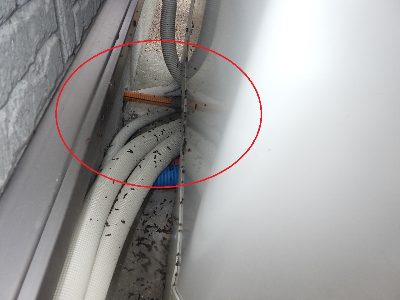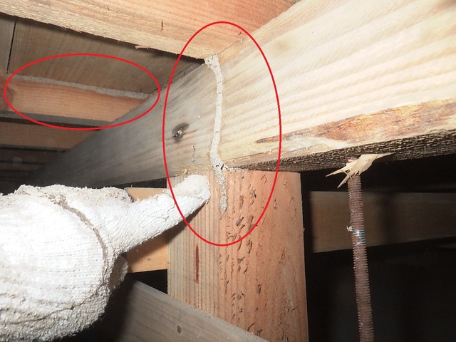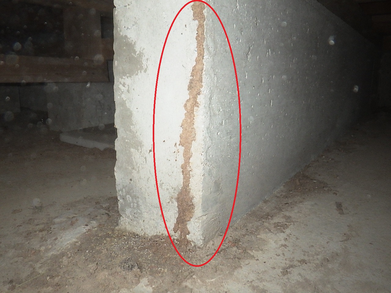 蟻道(土などで形成されたトンネル状のシロアリ専用通路)が確認でき、中にイエシロアリの生体が確認できました。