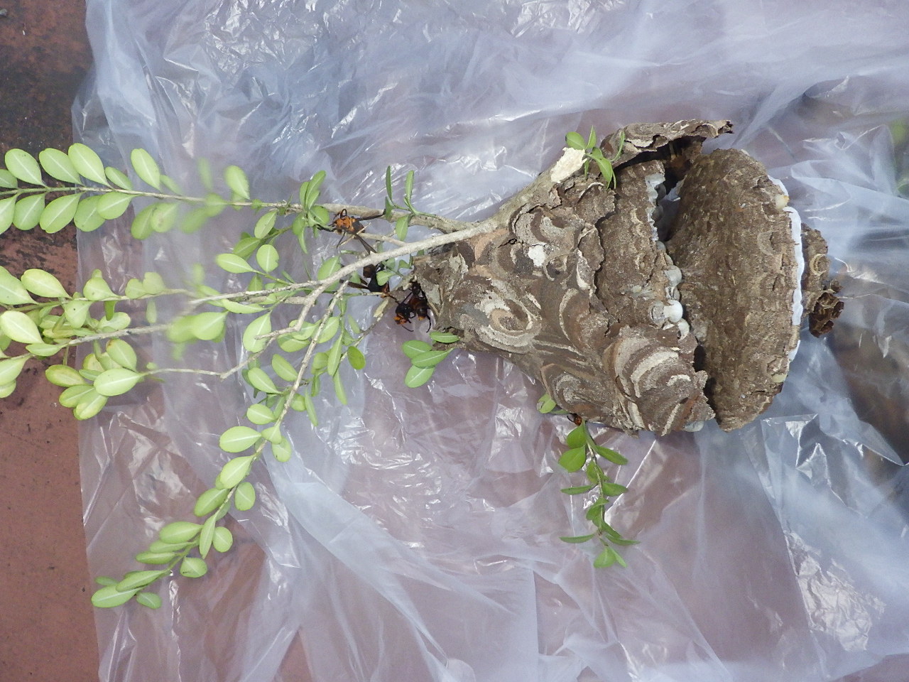 周りにはスーパーもあるため、中からハチを飛ばさないように手早く駆除し、巣を回収しました。