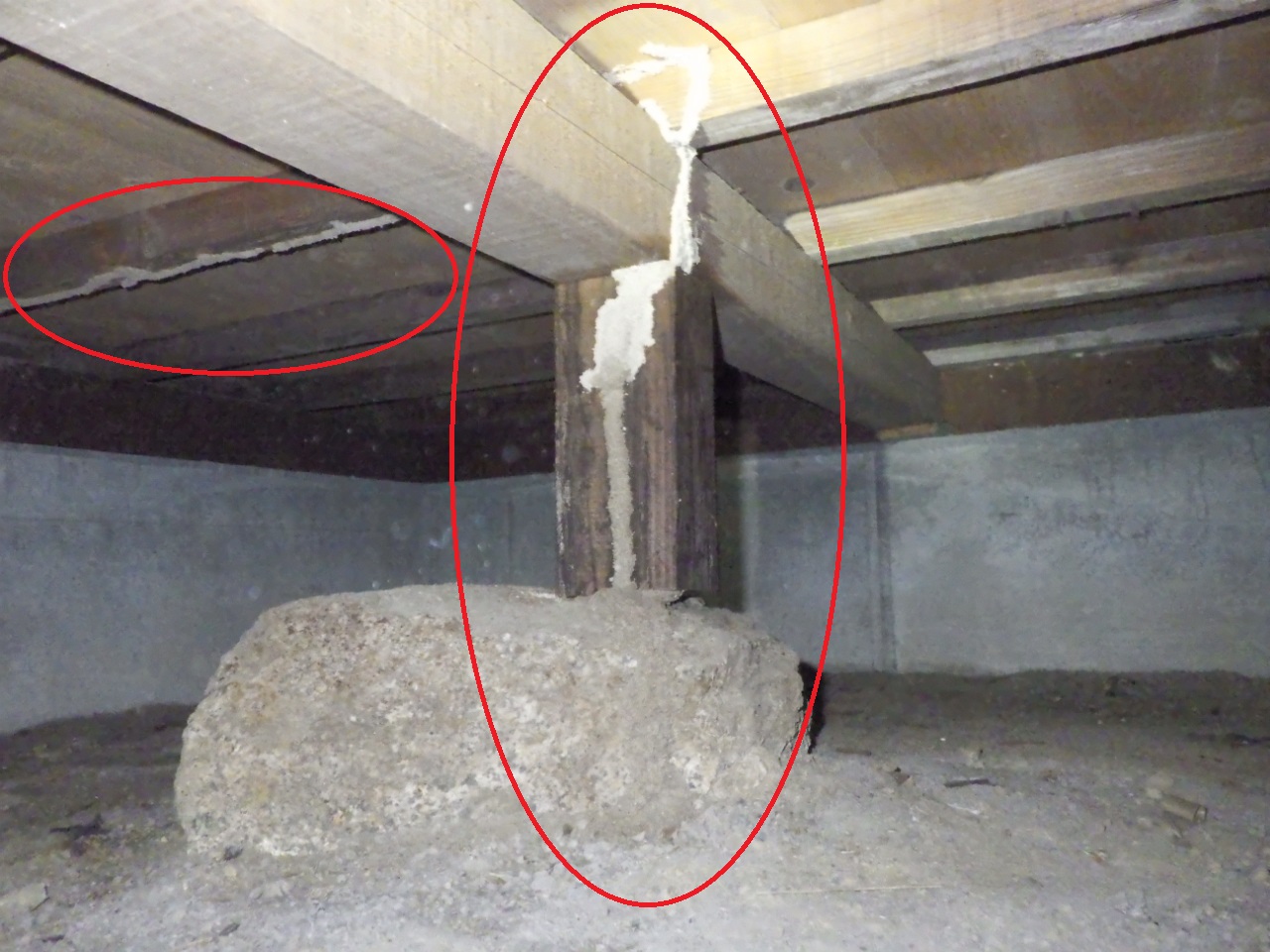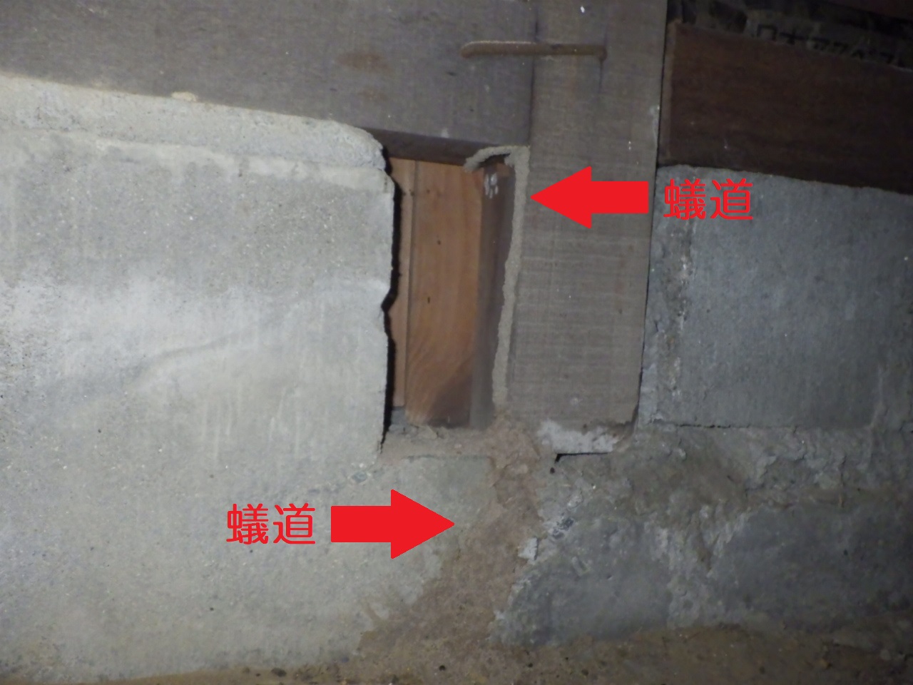 床下を調査すると、あちこちに蟻道(ぎどう:土などで形成されたトンネル状のシロアリ専用通路)が確認できました。