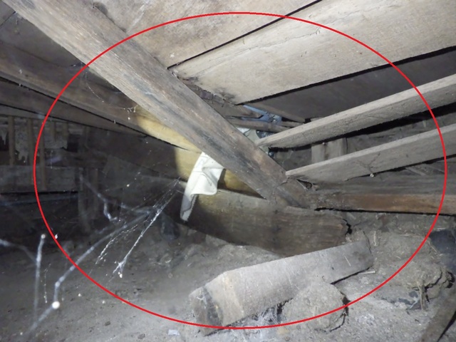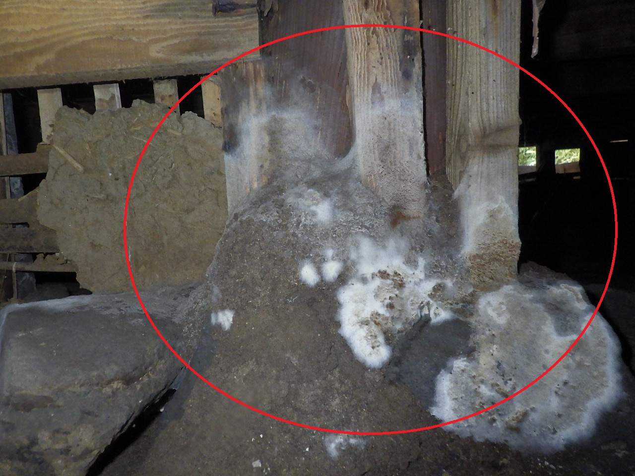 写真の白い部分は、ネコと思われる小動物が尿やフンをしたため、カビが発生しています。