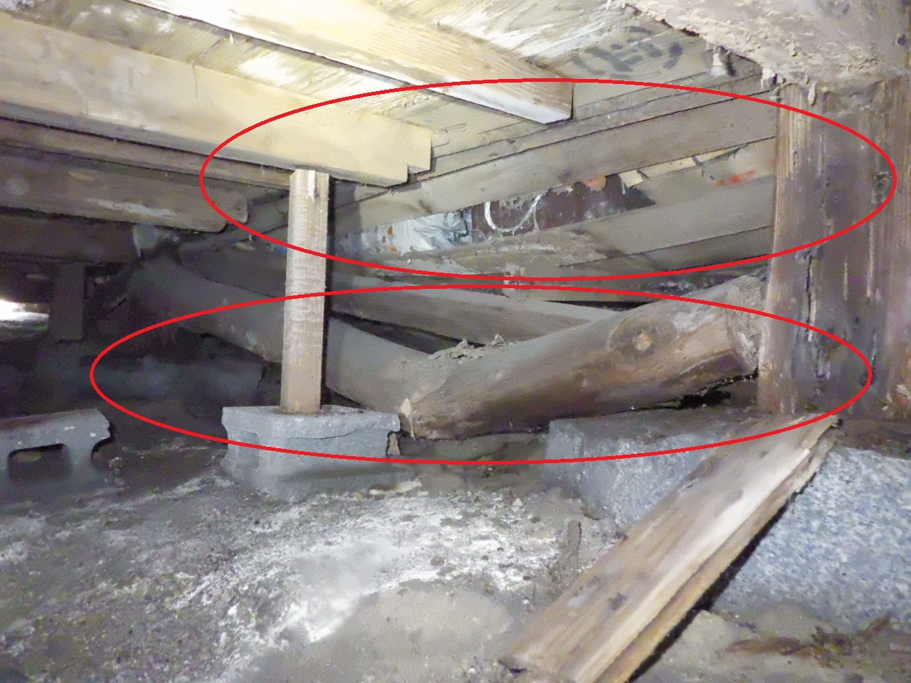床が傾いた部屋の床下に入ると、大引や根太材が折れているのが確認できました。