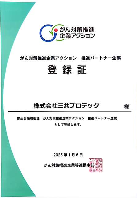 がん検診受診率向上を企業連携で推進していくことに賛同し、厚生労働省が推進する「がん対策推進企業アクション」推進パートナーに登録致しました。