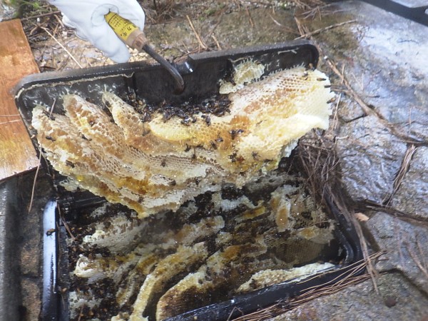 薬剤処理を行いフタを開けると、そこにはミツバチの巣がビッチリと詰まった状態でした(-_-;)