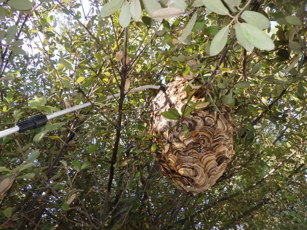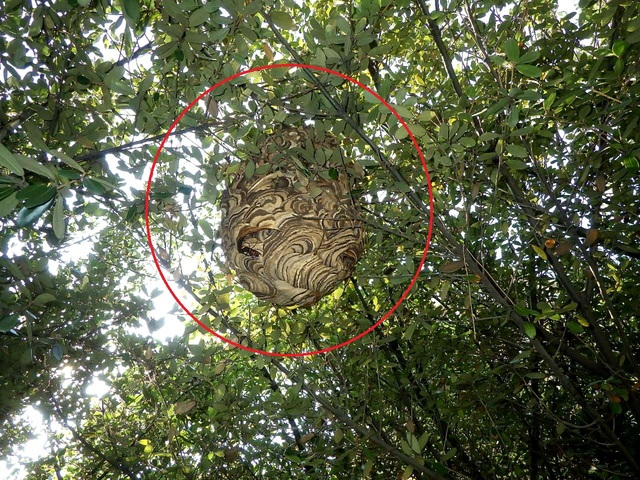樹木内の高さ3m程の場所に巣が確認でき、コガタスズメバチと同定できました。