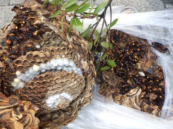戻りバチがいるものの、大多数は巣ごと駆除できました。