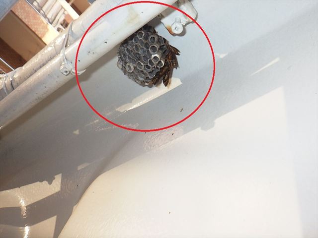 現場を確認すると、受水槽に巣が作られており、アシナガバチの姿も見られました。(今回はセグロアシナガバチでした)