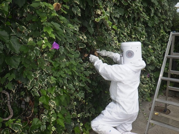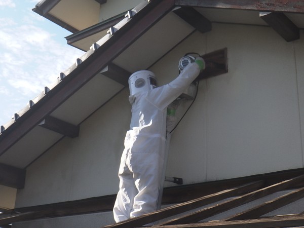 巣の位置を特定した後、作業員が防護服を装着して、ハチの駆除処理を行います。