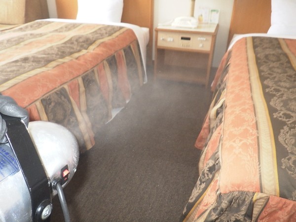 - 空間にULV処理と呼ばれる空間噴霧処理を施します。ミストの微粒子がダニの温床となるじゅうたんや、家具・家財の隙間に浸透させて、ダニの発生・増殖を抑えます。