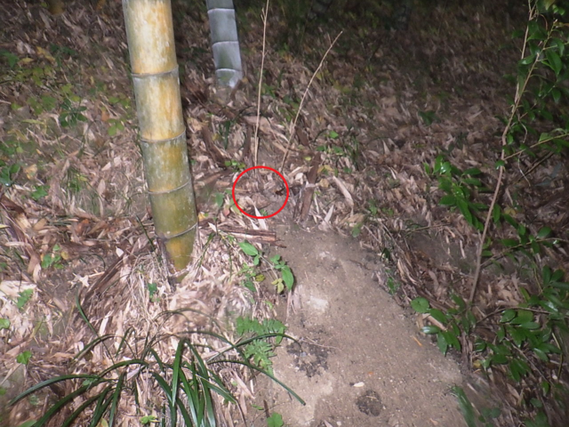 依頼主の方にハチを見かけた場所へ案内されると、山の裾野の竹藪にハチが飛んでいます。