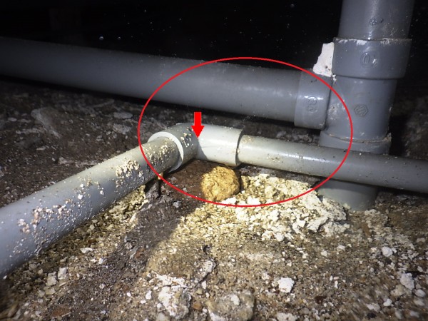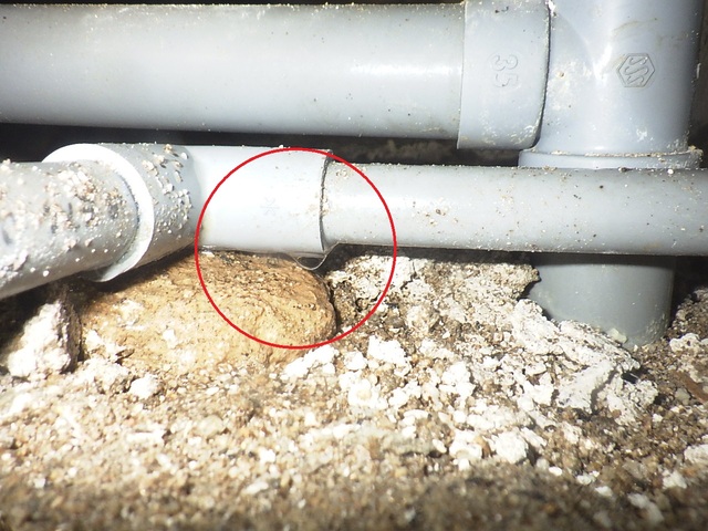 定期的に予防施工をされていることもあり、シロアリの侵入や被害は見られなかったのですが、調査していくと台所床下で水漏れを発見しました。