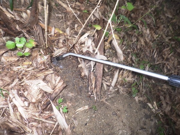 巣穴の位置を特定し、まず巣内のハチを駆除するために巣穴から薬剤を噴射。