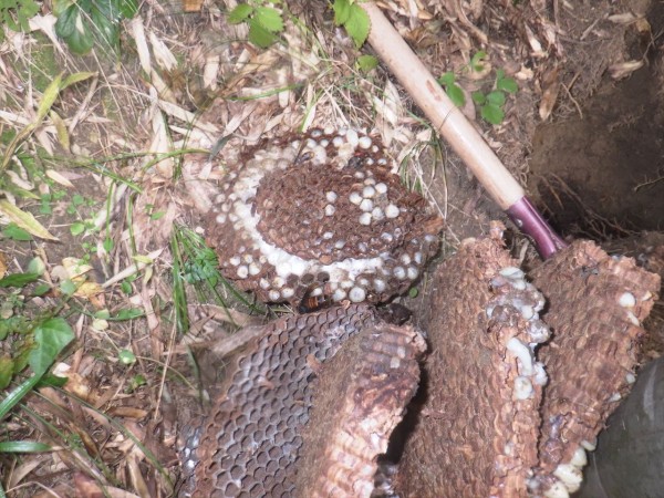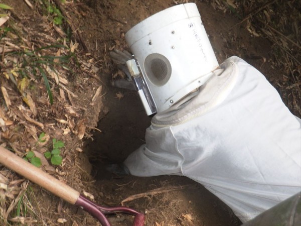 巣穴からハチが出てこなくなったのを確認して、巣を掘り出し撤去していきます。