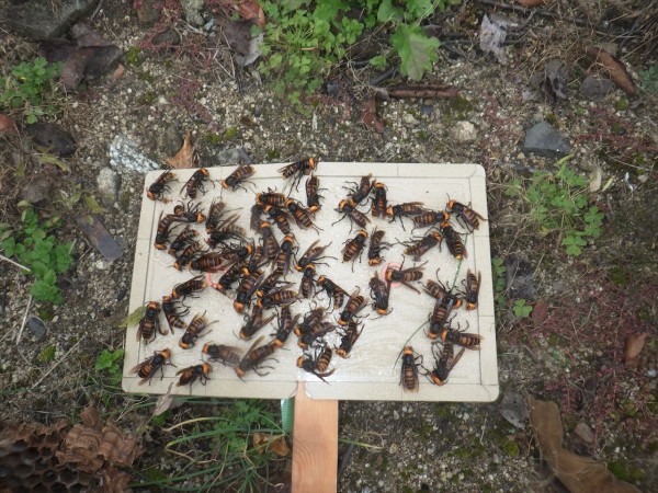 もう一人(私)は粘着板を使って、戻りバチを捕獲しています。