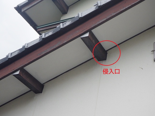 壁と母屋(もや)のすき間から天井裏に入り込んでいます。