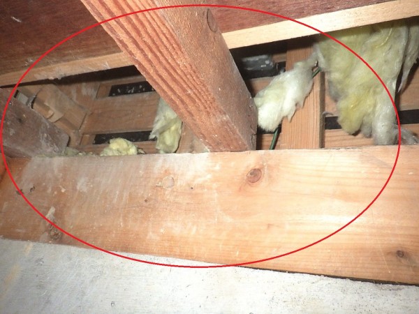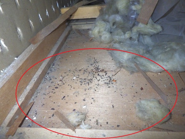 天井裏を確認すると、柿の皮や種が混じっているフンを複数箇所(上の写真の赤丸)で