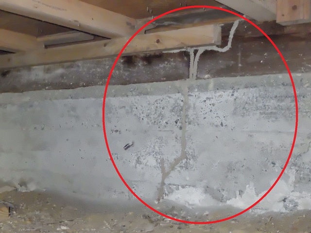 調査にお伺いした時はまだ寒い2月でしたがシロアリの被害が広範囲にわたって見られ、床下ではヤマトシロアリの生体・活動が見られました。(赤丸が蟻道、土や排泄物などで構成されたトンネル状の専用通路)