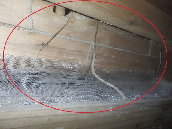 通気用の金網を乗り越えて、土台まで到達した蟻道です。
