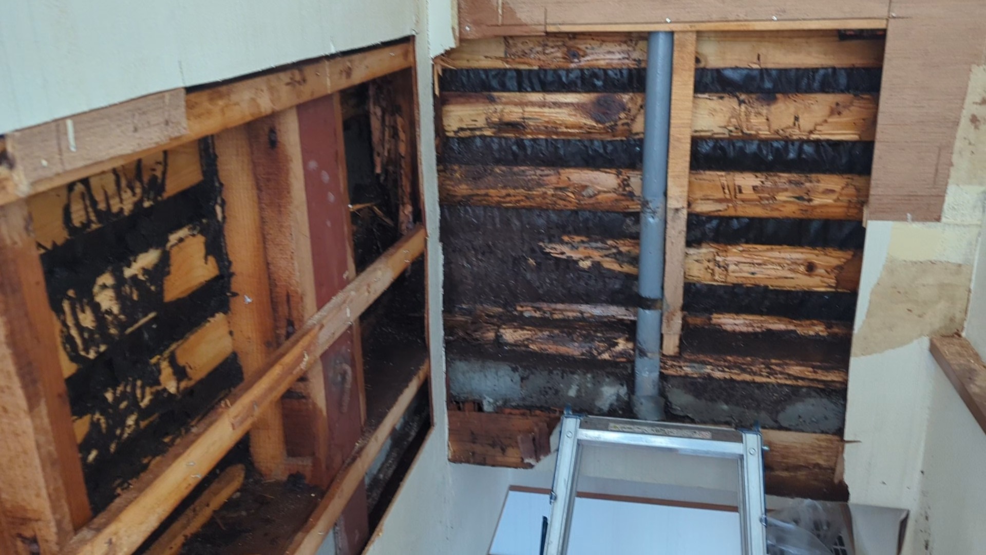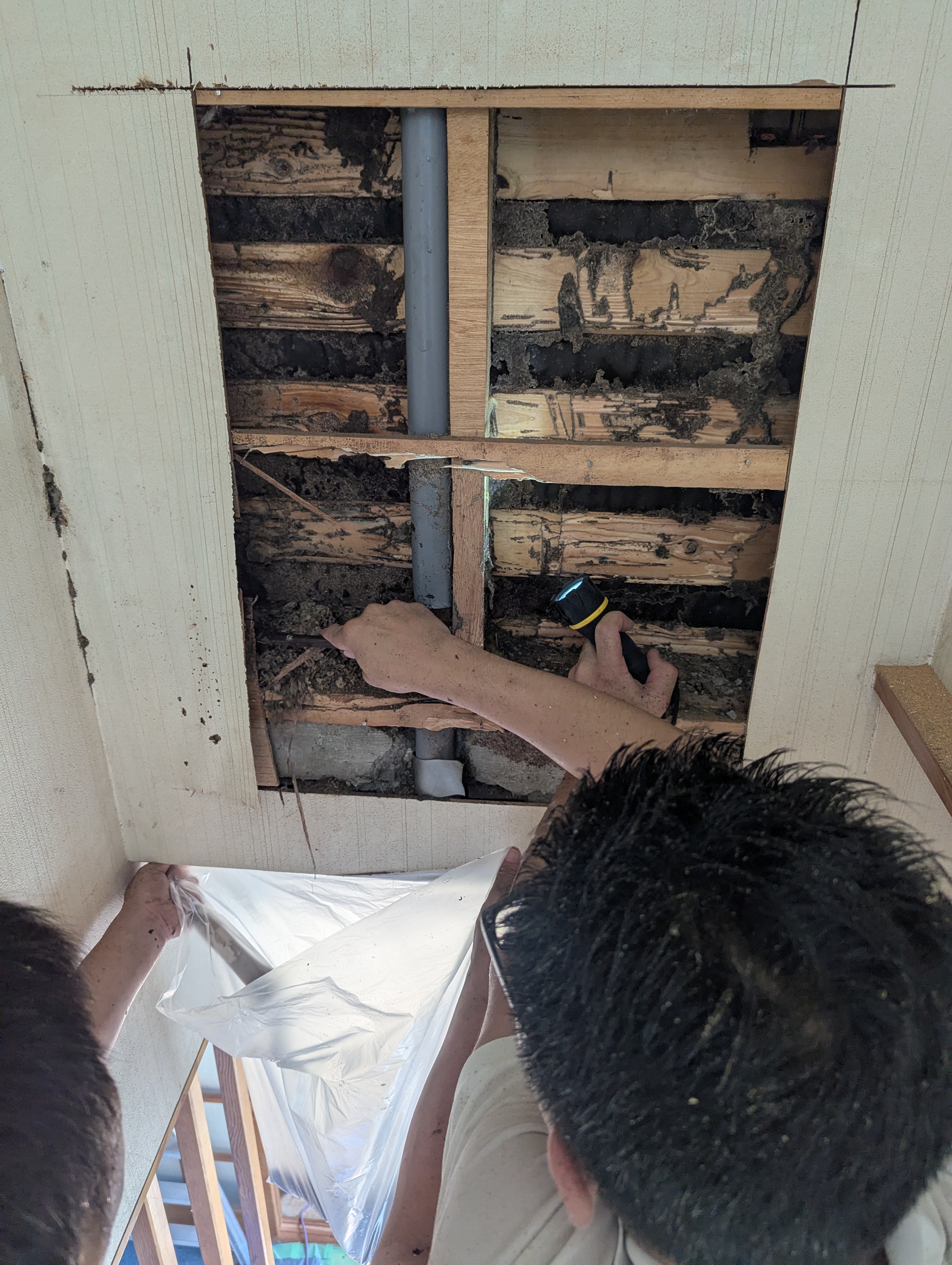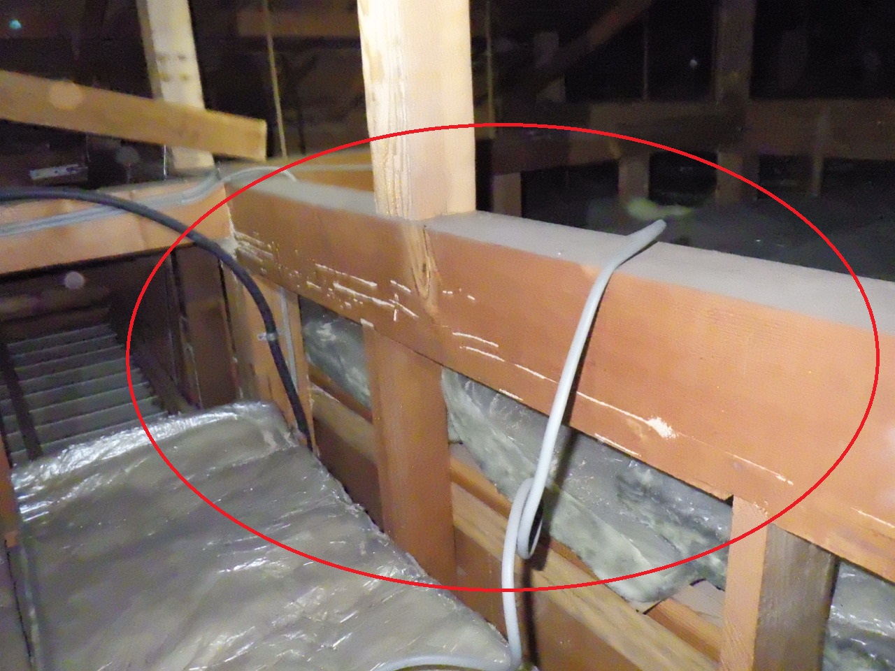 一部の梁(はり)材は、内部の半分程が食害されており、強度が低下していました。