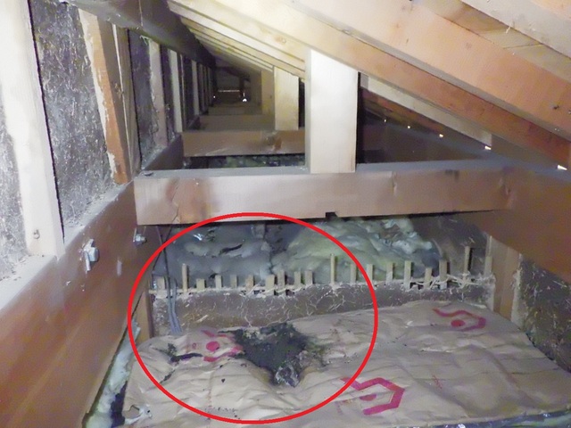 天井裏を確認すると、柿の皮や種が混じっているフンを複数箇所(上の写真の赤丸)で