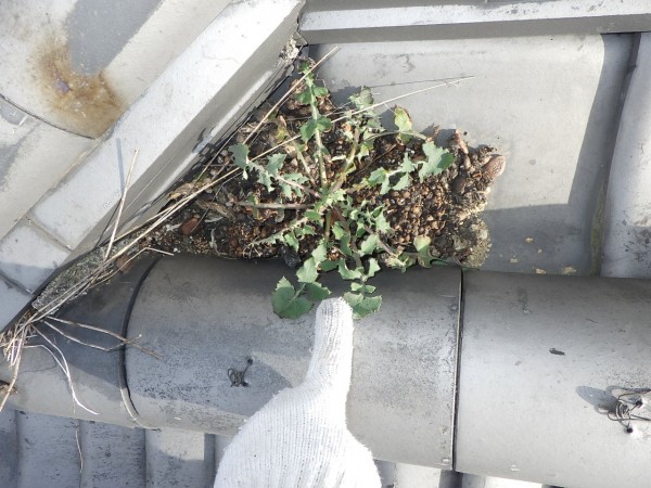 屋根瓦継ぎ目のすき間にもため糞が見られ、そこから植物の葉が伸びています。