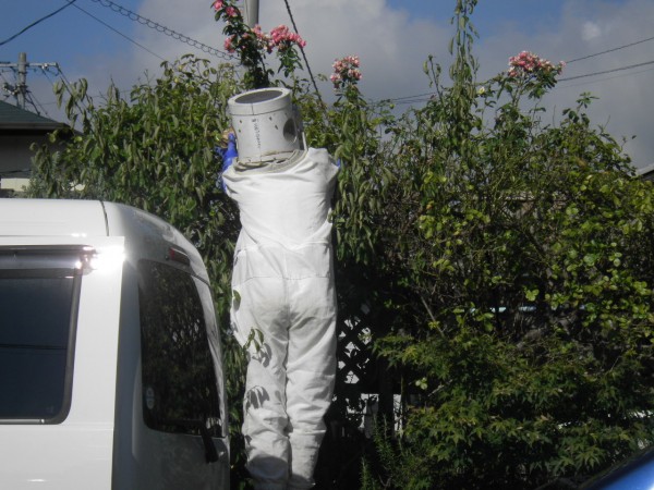 巣の位置を特定した後、作業員が防護服を装着して、ハチの駆除処理を行います。